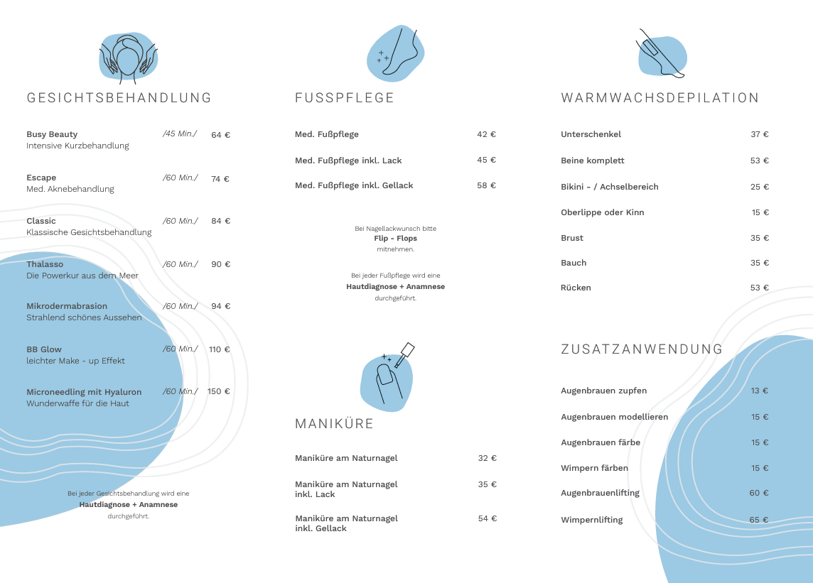 The layout uses a calming blue palette to evoke relaxation, while the background elements, inspired by liquid shapes, subtly reference cosmetic liquid products used in a cosmetic service. This combination creates a serene and cohesive visual experience that supports the brand’s calming aesthetic.